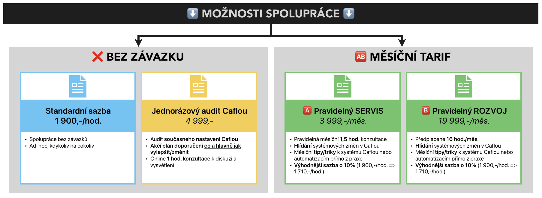 - Budete mít k dispozici 16 hod. měsíčně na jakoukoliv práci. Tedy pro konzultace, školení, servis Caflou/automatizací a další rozvoj. *