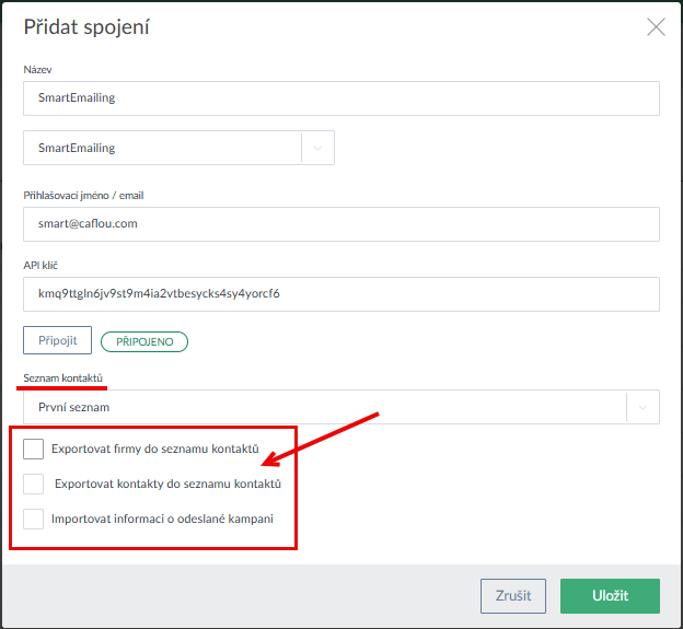 3) Zadáte Název spojení, zvolíte program, jako přihlašovací jméno použijete to, kterým se přihlašujete do SmartEmailingu, a zadáte dříve získaný API klíč a odkliknete Připojit.