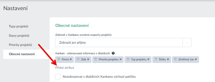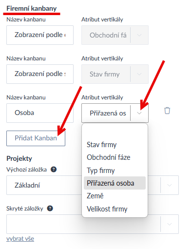 Novinkou je možnost vytvořit si vlastní Kanbany, kdy "vertikály" budou řazené dle vámi požadovaných atributů (např. přiřazená osoba, priorita, vlastní atribut typu "seznam" atd.). Je k tomu jen třeba, aby správce účtu zaškrtl v Nastavení dané sekce (firmy/projekty/úkoly/registry)