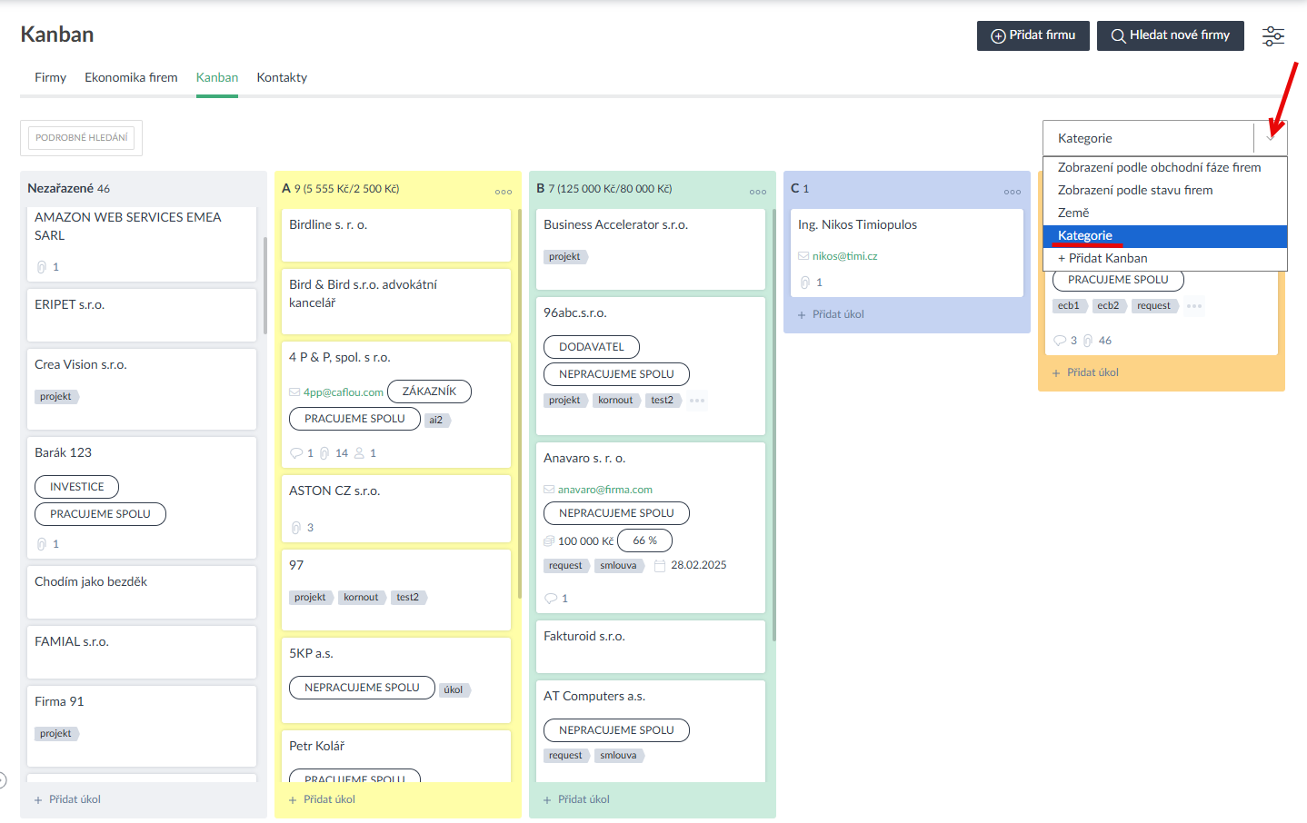Doposud bylo možné zobrazit Kanban nástěnky v sekci Firem podle stavu firem nebo podle obchodní fáze firem, v sekci Projektů a Úkolů pouze podle stavů projektů/úkolů, v Registru podle typu.