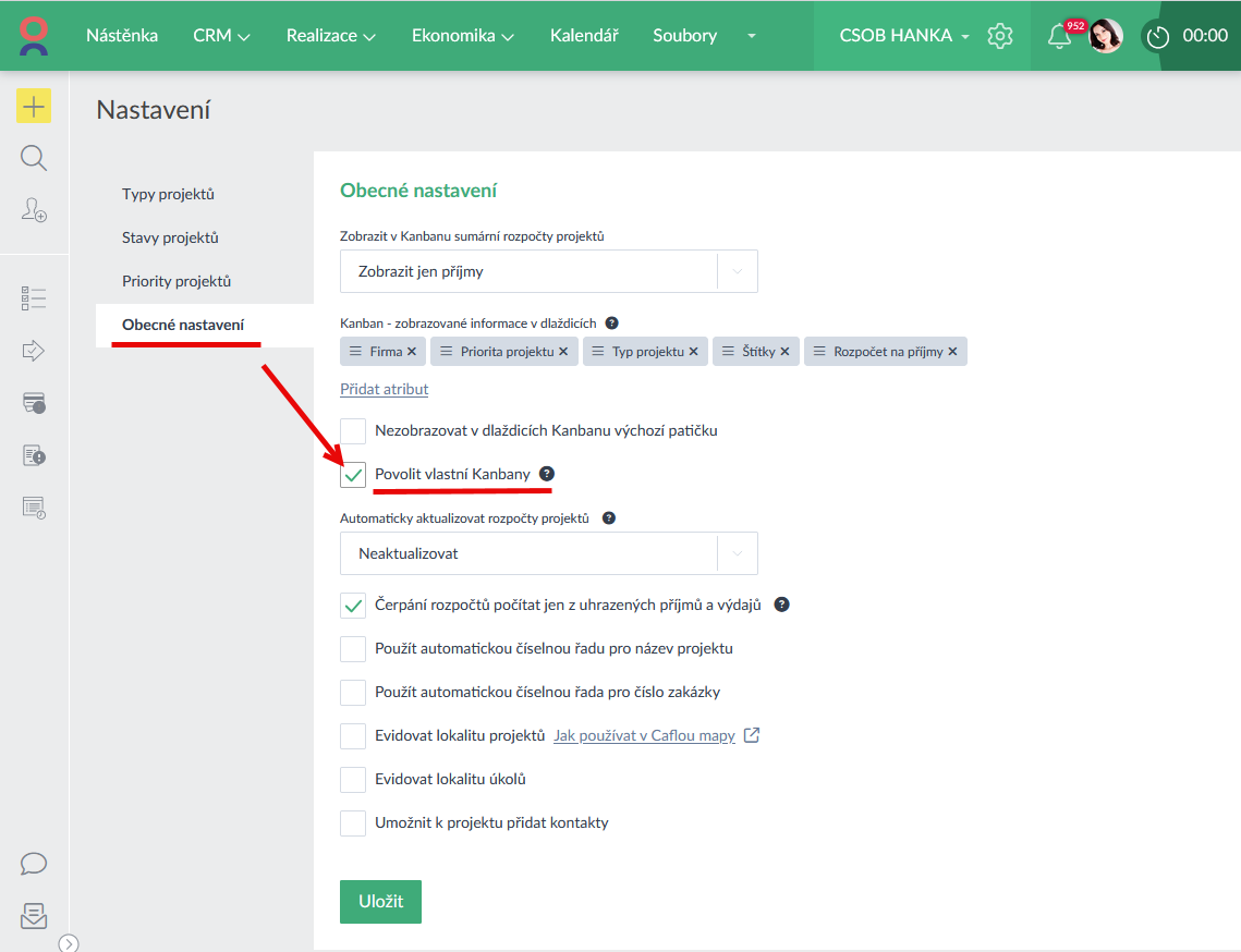- záložka Obecné nastavení - Povolit vlastní Kanbany.