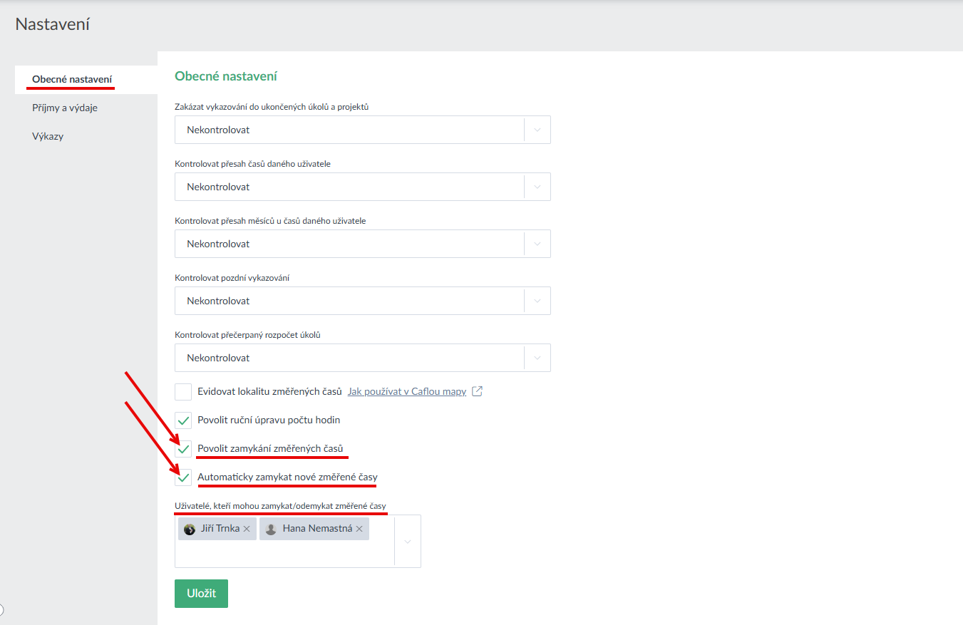 V záložce Obecné nastavení lze povolit zamykání změřených časů (obdobně jako u Výkazů).