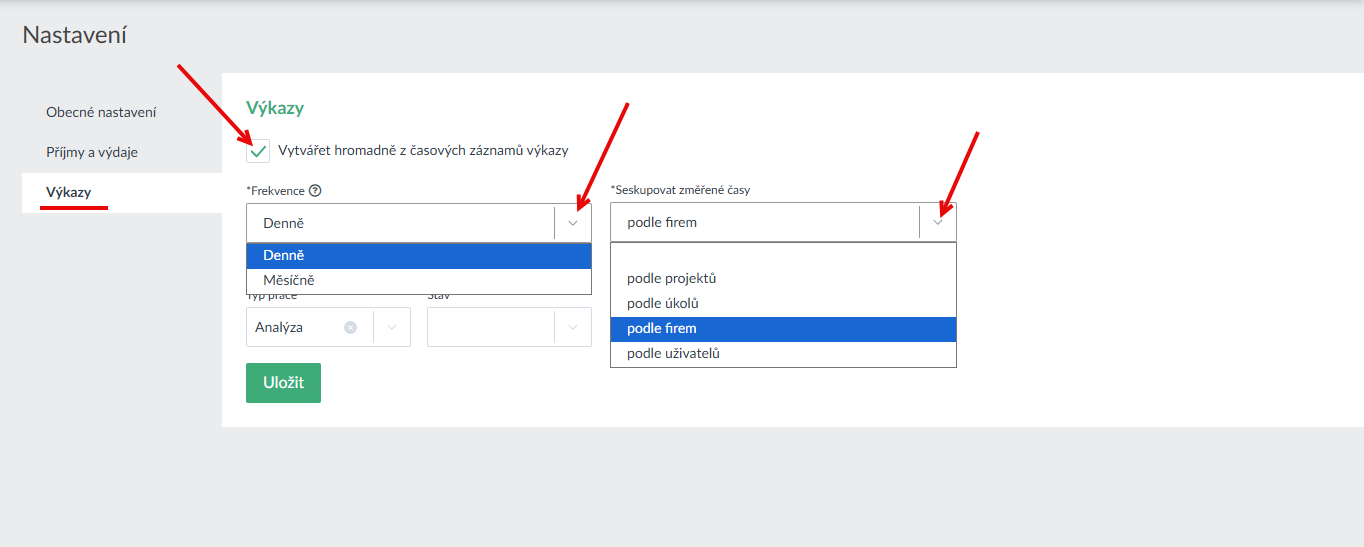 V záložce Výkazy lze nastavit hromadné vytváření výkazů z časových záznamů s požadovanou frekvencí (denně/měsíčně) a s možností seskupení podle projektů, úkolů, firem či uživatelů. Při denní frekvenci systém zpracuje změřené časy vytvořené za předchozí den. Při měsíční frekvenci systém zpracuje změřené časy vždy 1. den v měsíci pro změřené časy vytvořené předchozí měsíc. A zároveň máte možnost u vytvořeného výkazu nastavit Typ práce, Stav, Štítky a Schváleno.