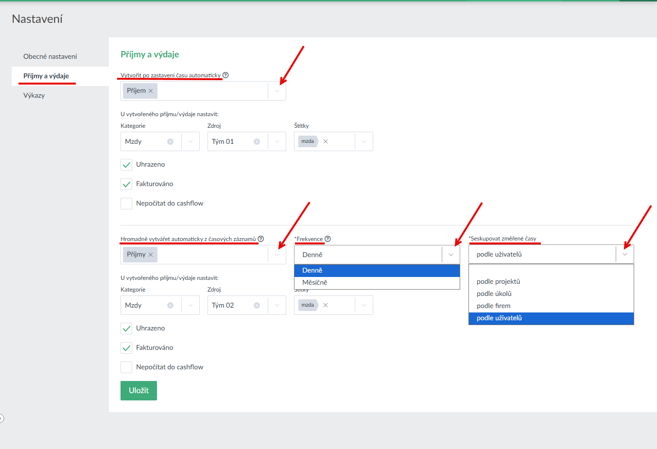 Automatické propisování změřených časů do výdajů nebo příjmů lze nastavit v Nastavení sekce Změřené časy v záložce Příjmy a výdaje:
