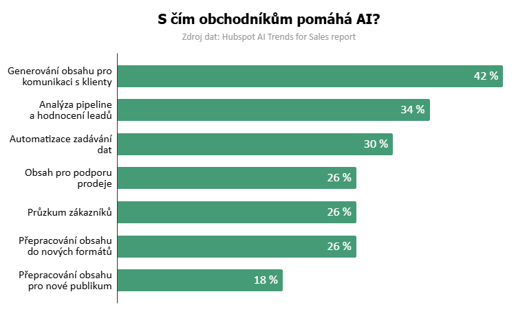 Data ukazují, že obchodníci využívají AI hlavně pro generování obsahu při komunikaci s klienty a analýzu příležitostí. Stává se nedílnou součástí prodejního procesu. Vyzkoušejte následující tipy v praxi.