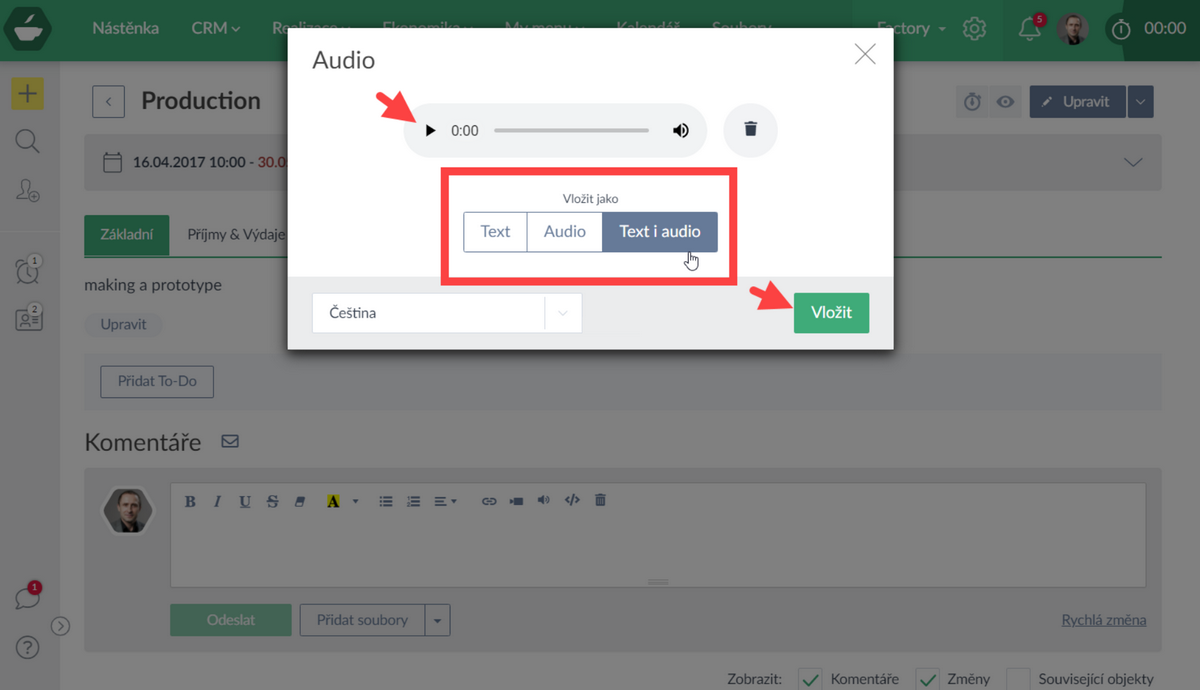 V Caflou můžete nahrát hlasovou zprávu do komentáře a AI ji přepíše jako text. Tato funkce přijde vhod při interní komunikaci, když chcete rychle zaznamenat myšlenku nebo zadání například z mobilu.