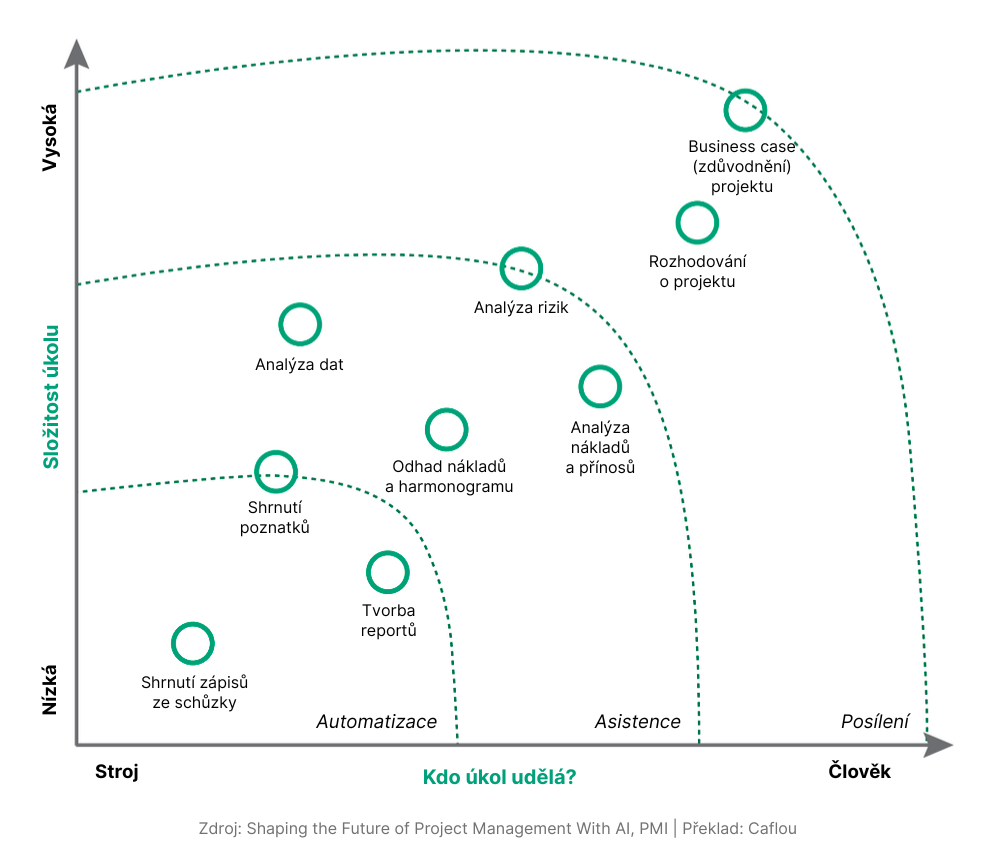 Jak ukazuje graf níže, technologie v rámci projektového řízení mohou odbavit celou řadu úkolů automatizovaně. U složitějších činností pak umělá inteligence funguje jako asistent. U těch nejkomplexnějších zůstává hlavní slovo lidem a AI přispívá k lepším výsledkům.