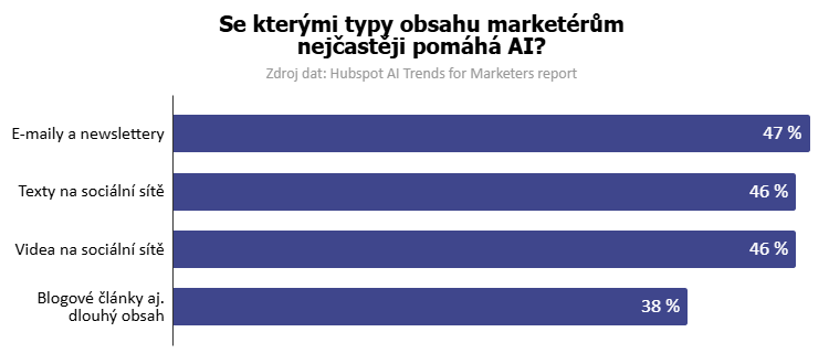 Díky AI už příprava obsahu nemusí být tak časově náročná jako dřív. Marketéři s umělou inteligencí nejčastěji tvoří e-maily, newslettery a příspěvky na sociální sítě.