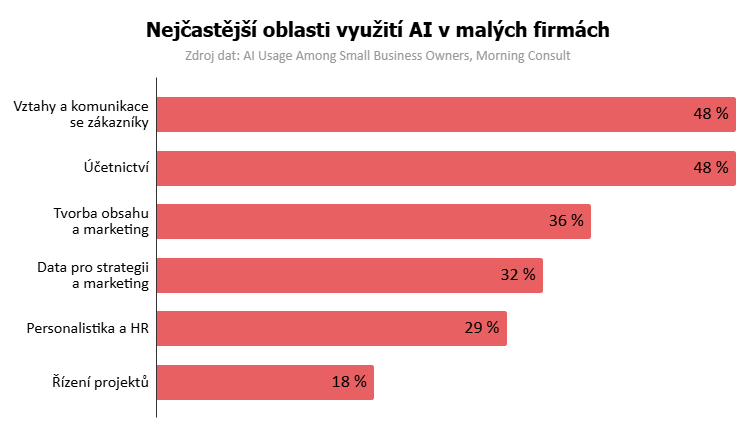 Podle průzkumu Morning Consult majitelé malých podniků nejčastěji používají AI v komunikaci se zákazníky, účetnictví a marketingu.