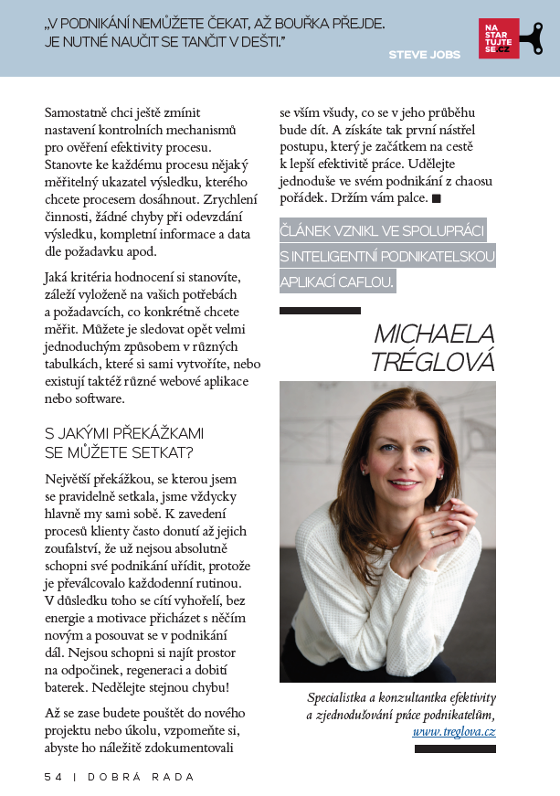 Ve spolupráci s paní Ing. Michaelou Tréglovou, specialistkou a konzultantkou efektivity a zjednodušování práce podnikatelům, jsme pro vás připravili Caflou akademii II - kontrolujte své podnikání.