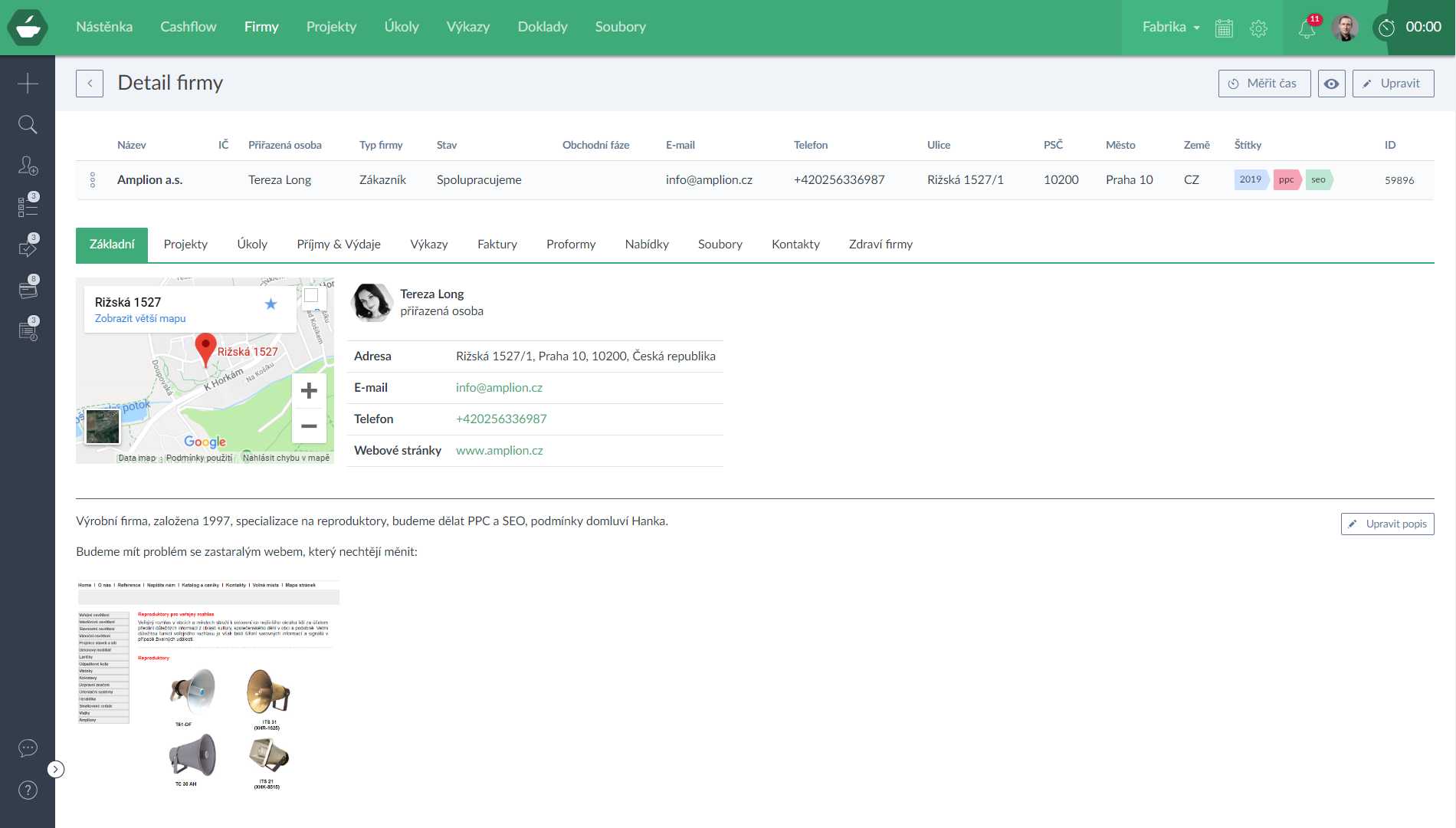 💡 Vůbec nejlepším řešením při řízení firmy je pracovat s takovým nástrojem, který v sobě sdružuje specifické moduly pro řízení jednotlivých firemních oblastí. Např. když CRM systém je propojený s finančním modulem, sleduje platební morálku klienta a dokáže vyhodnocovat i jeho bonitu. Nebo když na jedno kliknutí vidíte u klienta detaily zakázky v rámci celého projektu, který sleduje jeho časovou a finanční náročnost, zobrazuje, kdo a kdy na zakázce pracuje apod.