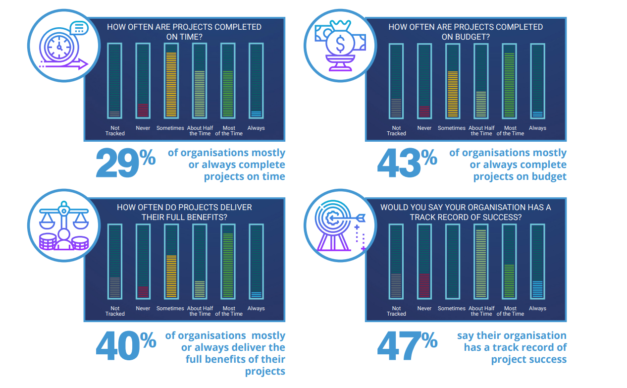 Přesto existuje naděje – nedávné statistiky projektového řízení ukazují, že čtyři z deseti firem většinou nebo vždy dokážou realizovat úspěšné projekty se všemi spojenými výhodami. Téměř polovina dotazovaných organizací uvádí, že na základě historické zkušenosti jsou schopny doručovat úspěšné projekty.