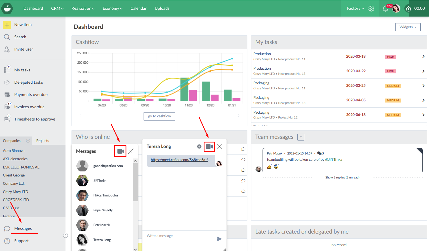 Přijetí komplexní platformy, jako je například Caflou, je vhodnou možností, jak soustředit všechny funkce na jednom místě. Je vybavena nástroji pro chat a online video, které jsou přirozeně integrovány do platformy, aby váš tým mohl komunikovat bez nutnosti přepínání mezi aplikacemi.