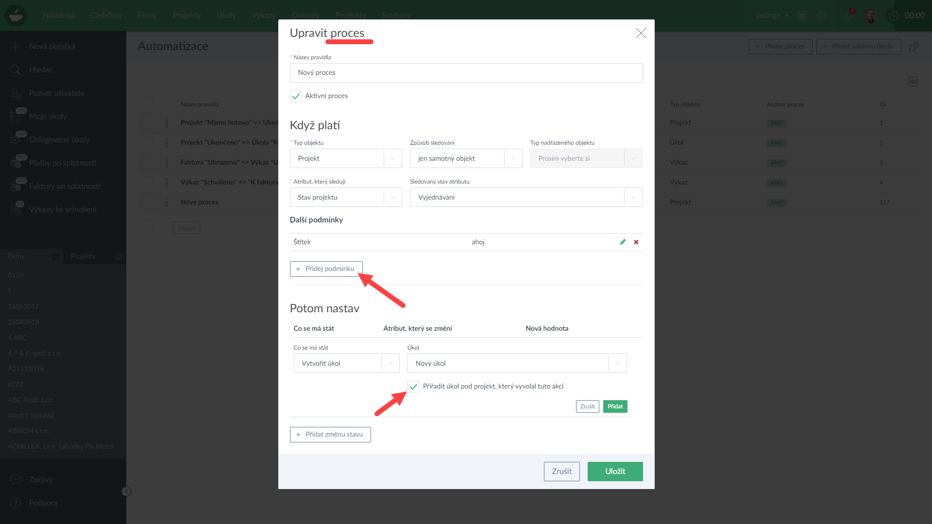 - Můžete na základě splněných podmínek automaticky vytvářet úkoly, notifikovat uživatele, odesílat emaily