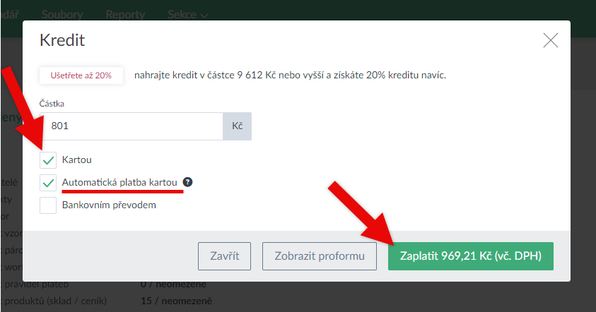 - zpravidla se jedná o frekvenci měsíční či roční, nicméně přesný termín se odvíjí od očekávaného vyčerpání kreditu, ke kterému může dojít o něco dříve nebo naopak později (např. se zvětší velikost účtu nebo čerpáte kredit i skrze další hrazené aktivity jsko je např. vytěžování faktur, elektronické podpisy apod.)