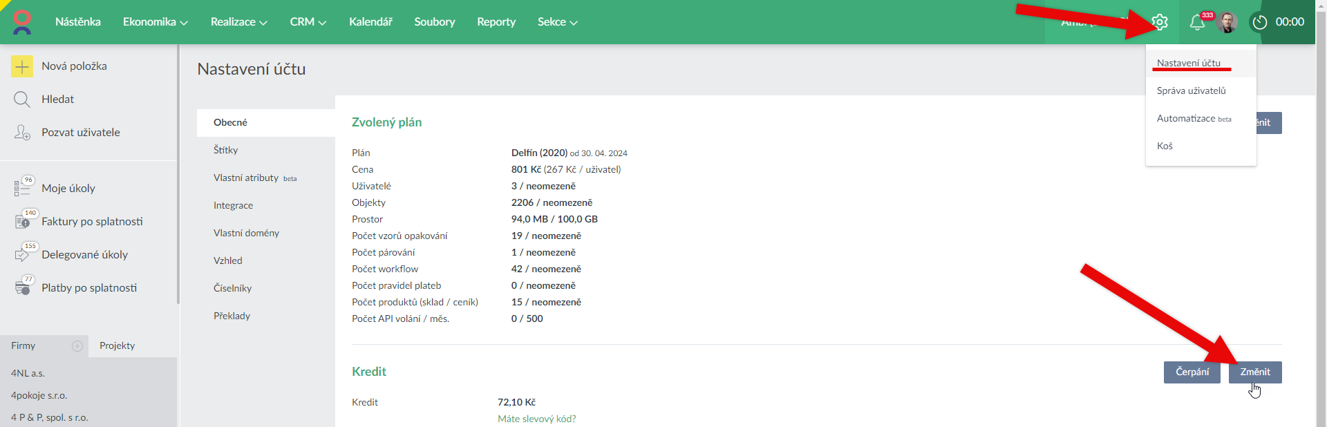 - v Nastavení účtu, sekci Kredit, vidíte, že je aktivní automatická platba kartou a kdy a který uživatel tuto funcki aktivoval