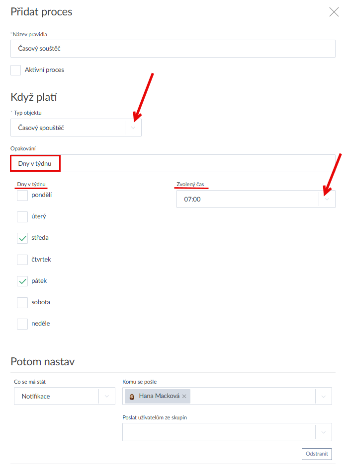 Doposud bylo možné spustit automatický proces pouze splněnou podmínkou u konkrténího typu objektu, např. změnou stavu či jiného parametru na objektu (např. stavu úkolu, projektu...atp.). Nově je lze spustit automatický proces i skrze splněnou podmínku na čas. Tj. lze si vybrat dny v týdnu, dny v měsíci a konkrétní časy, kdy se má proces spustit a vykonat akci.