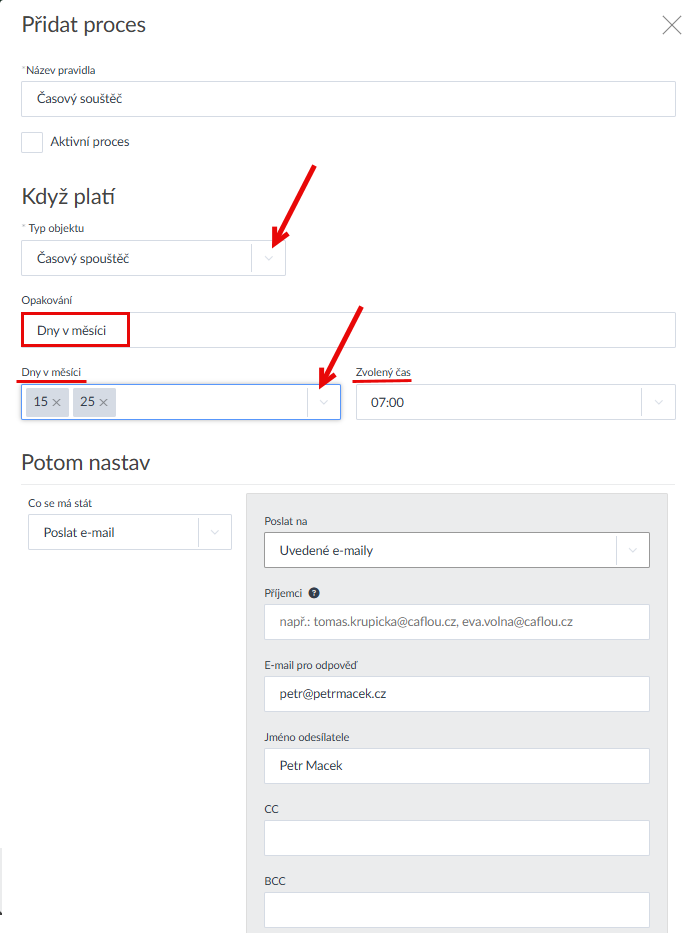 nebo každého 15. a 25. v měsíci v 7:00 poslat kolegům e-mail (sms, notifikaci nebo třeba vytvořit úkol, událost ze šablony):