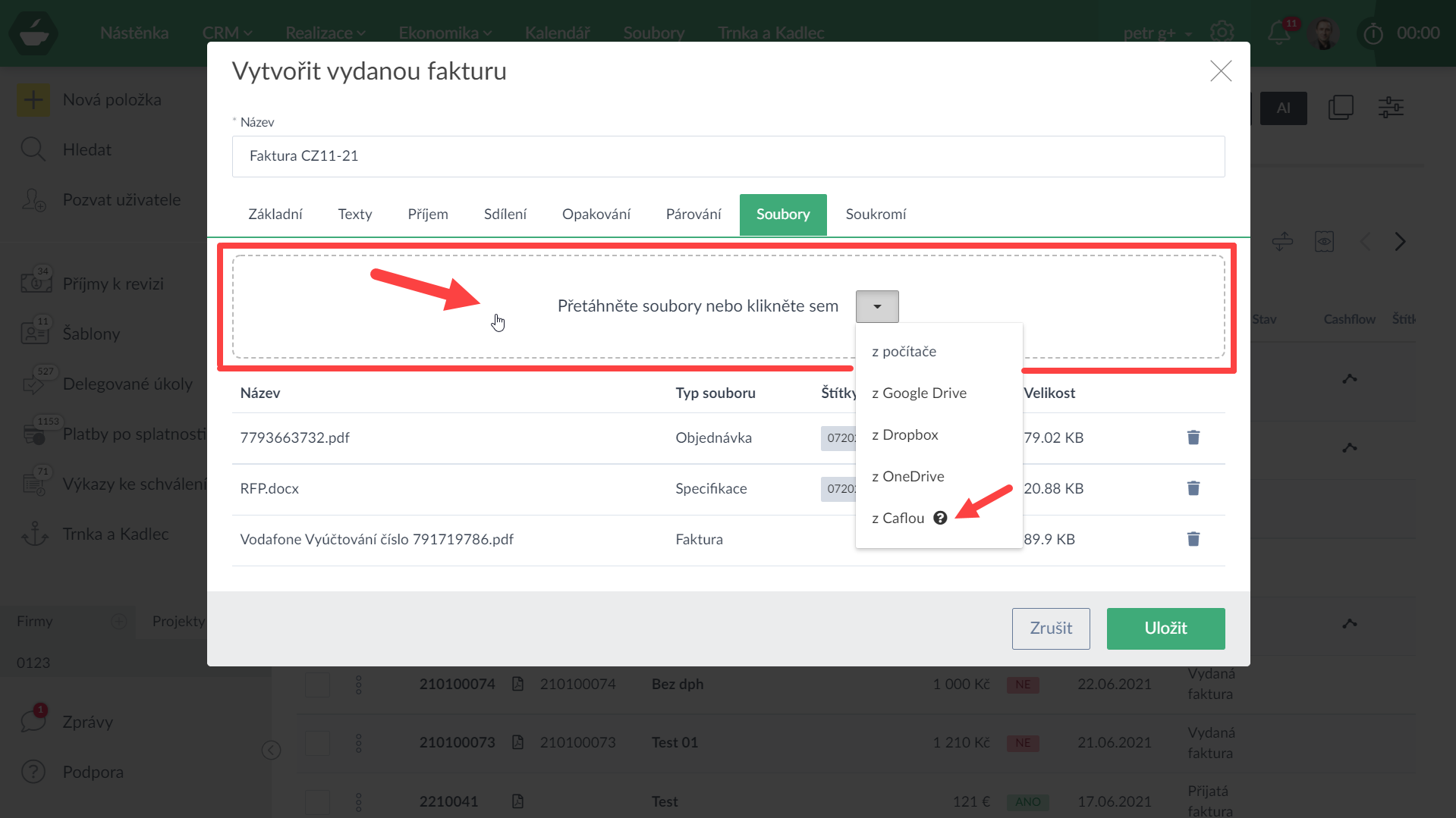 - Ke všem objektům lze nyní přiložit i soubor, který už v účtu máte - jde o volbu "z Caflou" u přidávání souborů. Hodí se např. u fakturace, kdy třeba chcete přiložit soubor z projektu k faktuře (zde pozor, touto volbou může dojít k přesunu souboru z původního objektu do nového, tzn. do té faktury u zmíněného příkladu, pokud třeba faktura patří pod jinou firmu než projekt).