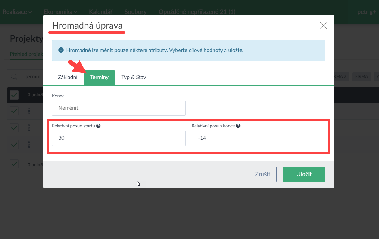 U projektů a úkolů můžete nyní hromadně posouvat termíny začátků a konců a to relativně. Tedy konec nebo začátek všech zvolených úkolů/projektů můžete posunout o zvolený počet dní a to: