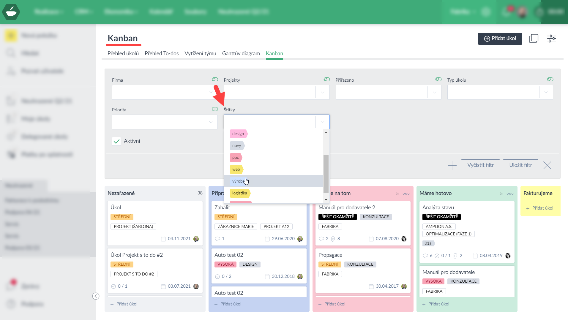 8) "Nadprojektový" Kanban má nově filtr na úkolové štítky