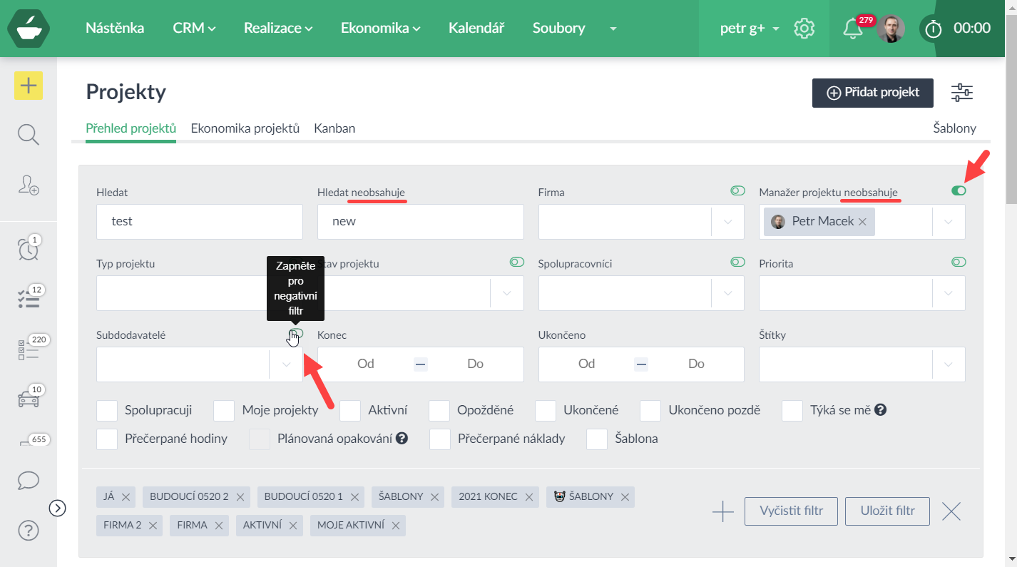 Pokud používáte filtry a potřebujete některý parametr vyloučit, můžete nyní použít negativní/vylučující filtry: