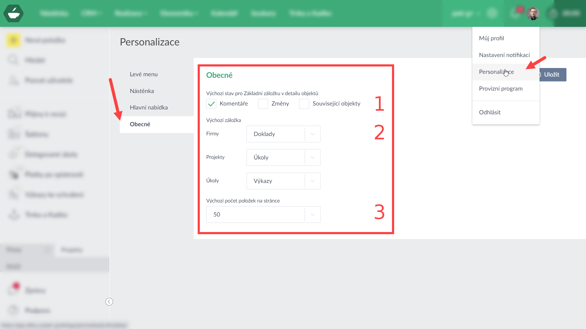 - můžete si zvolit "startovací" záložku v detailu firem, projektů a úkolů, např. u projektů můžete vždy startovat na záložce "Úkoly" místo nynější záložky "Základní"