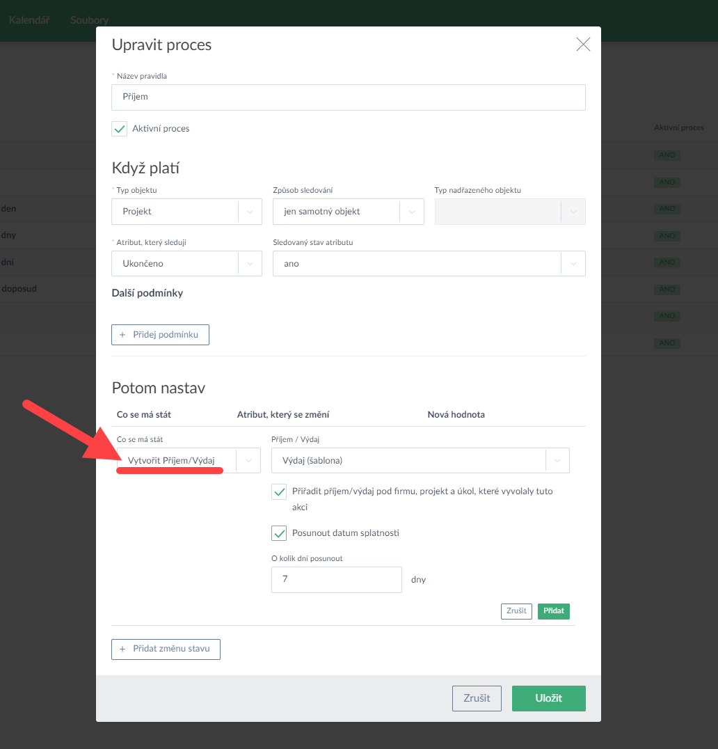 Stejně jako je možné procesem ze šablony vytvořit úkol, projekt, výkaz a doklad, tak nyní lze procesem vytvořit i příjem nebo výdaj ze šablony. Např. ukončíte projekt určitého typu a tato změna může automaticky vytvořit příjem (nebo výdaj), který se zařadí do daného projektu. Zároveň můžete splatnost takto vzniklého příjmu/výdaje posunout o potřebný počet dní vpřed (např. 14 dní od vytvoření).