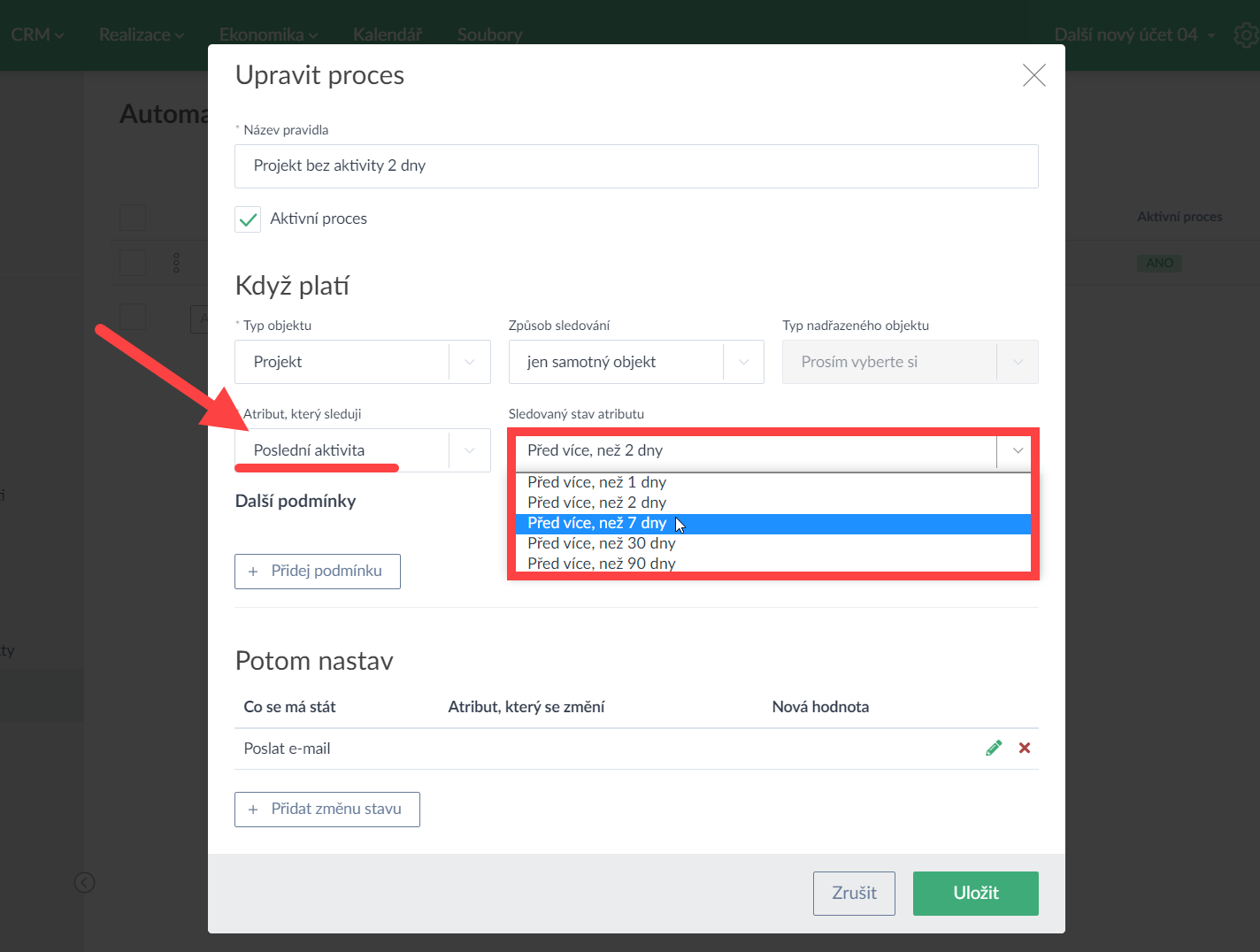 Nově můžete reagovat na úkoly a projekty, u kterých nedošlo k aktivitě po delší než žádanou dobu. Např. u urgentních úkolů nechcete, aby úkol "stál" bez povšimnutí déle než 1 den, pokud se tomu stane, pak v rámci procesu můžete reagovat - např. odeslat e-mail nebo úkol třeba přeřadit na jinou osobu apod.