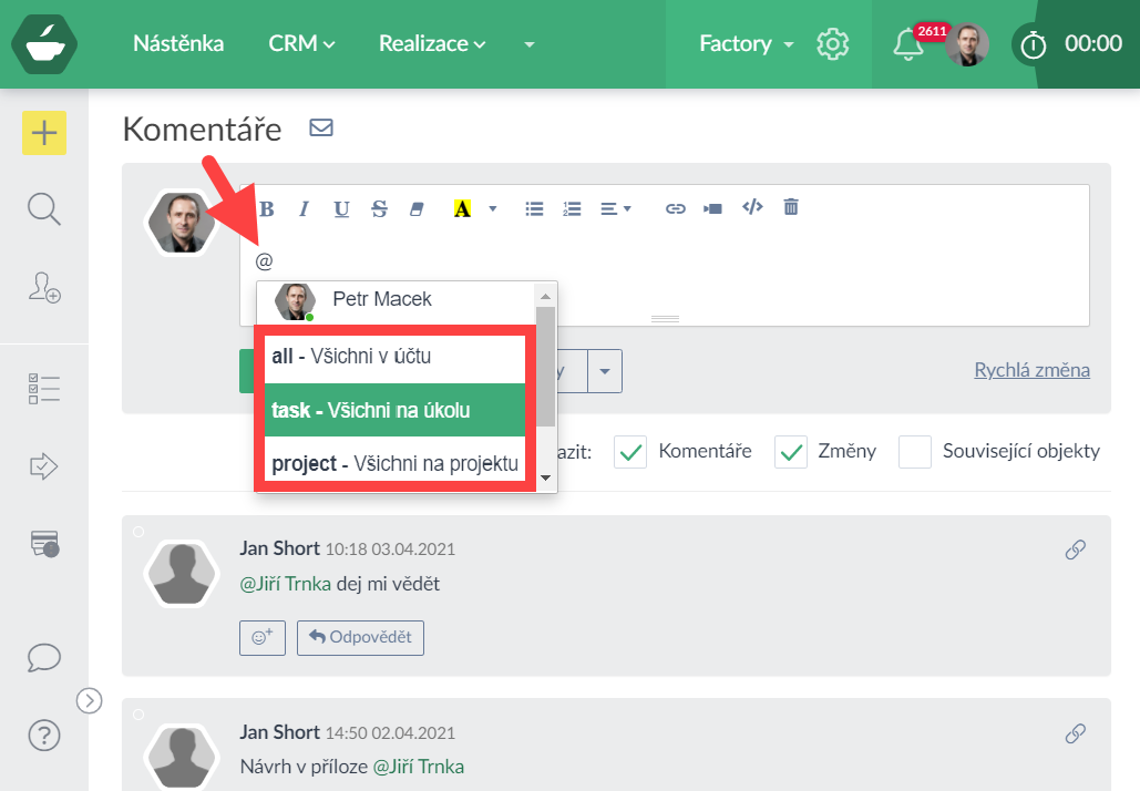 Např. pokud komentujete úkol (nebo třeba výkaz, soubor, doklad atd.) v projektu ABC a zvolíte @project (Všichni na projektu), pak všem uživatelům s rolí na projektu, ve kterém je tento úkol (výkaz, soubor, doklad atd.) přijde notifikace o tom, že byli zmíněni (=upoutá to jejich pozornost více než jen běžná notifikace).