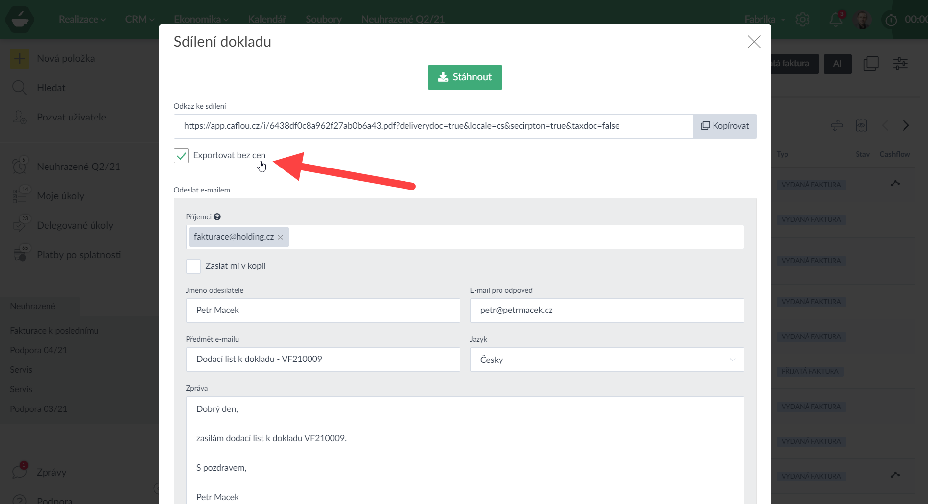 Dodací list lze nyní exportovat nebo sdílet také bez cen. Na dodacím listu pak nevidíte ceny jednotek, ani sumární ceny, pouze počty a názvy položek.
