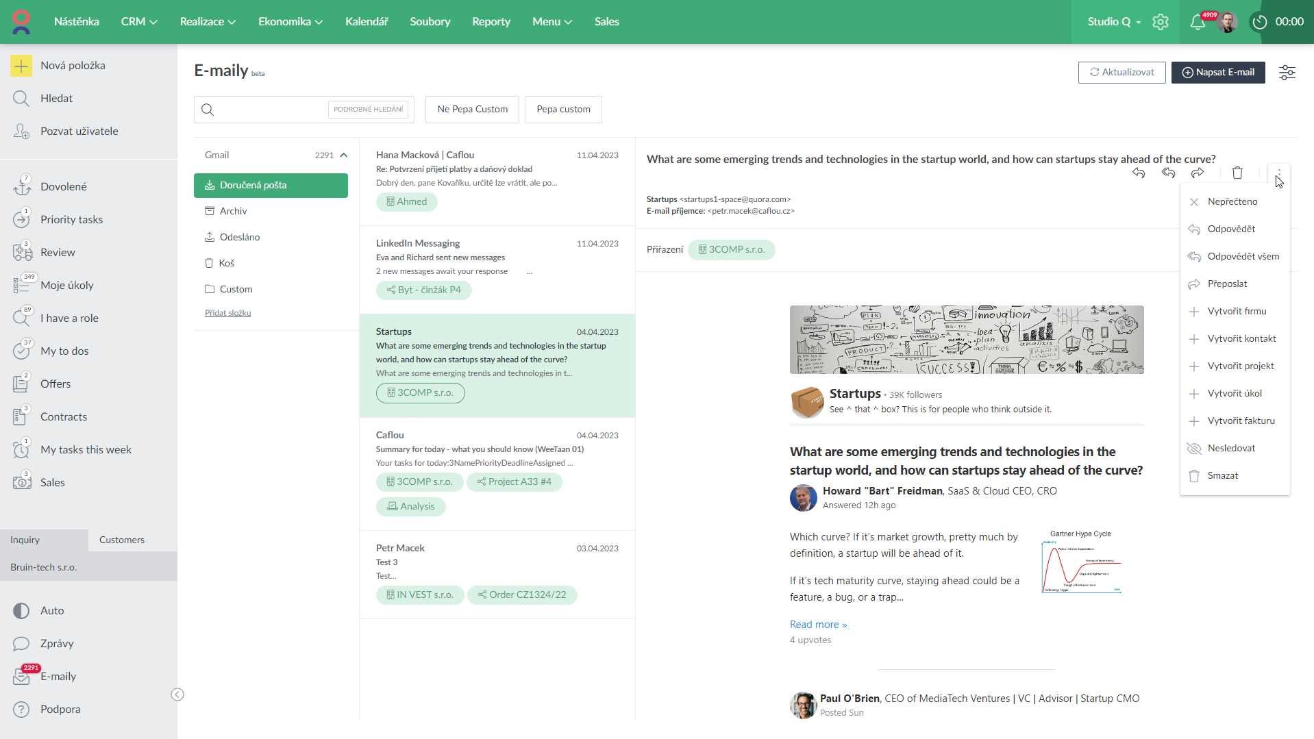 - Z e-mailu lze začít měřit čas (pokud je e-mail zařazen pod firmu, projekt či úkol, toto zařazení se použije pro výkaz)
