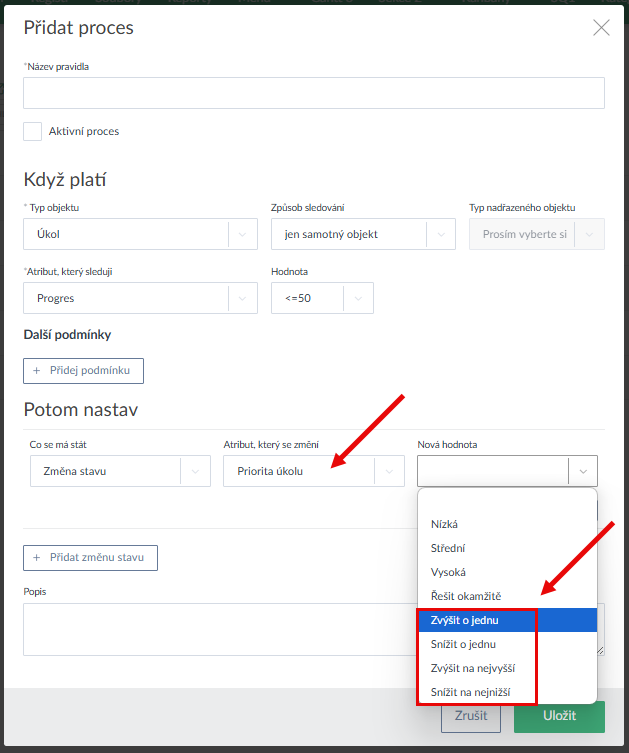 Automatické procesy nově umožňují u úkolů a projektů dynamicky měnit priority tj. zvýšit nebo snížit prioritu o jednu, zvýšit na nejvyšší nebo snížit na nejnižší prioritu. Doposud šla měnit priorita jen fixně (nízká/střední/vysoká/řešit okamžitě).
