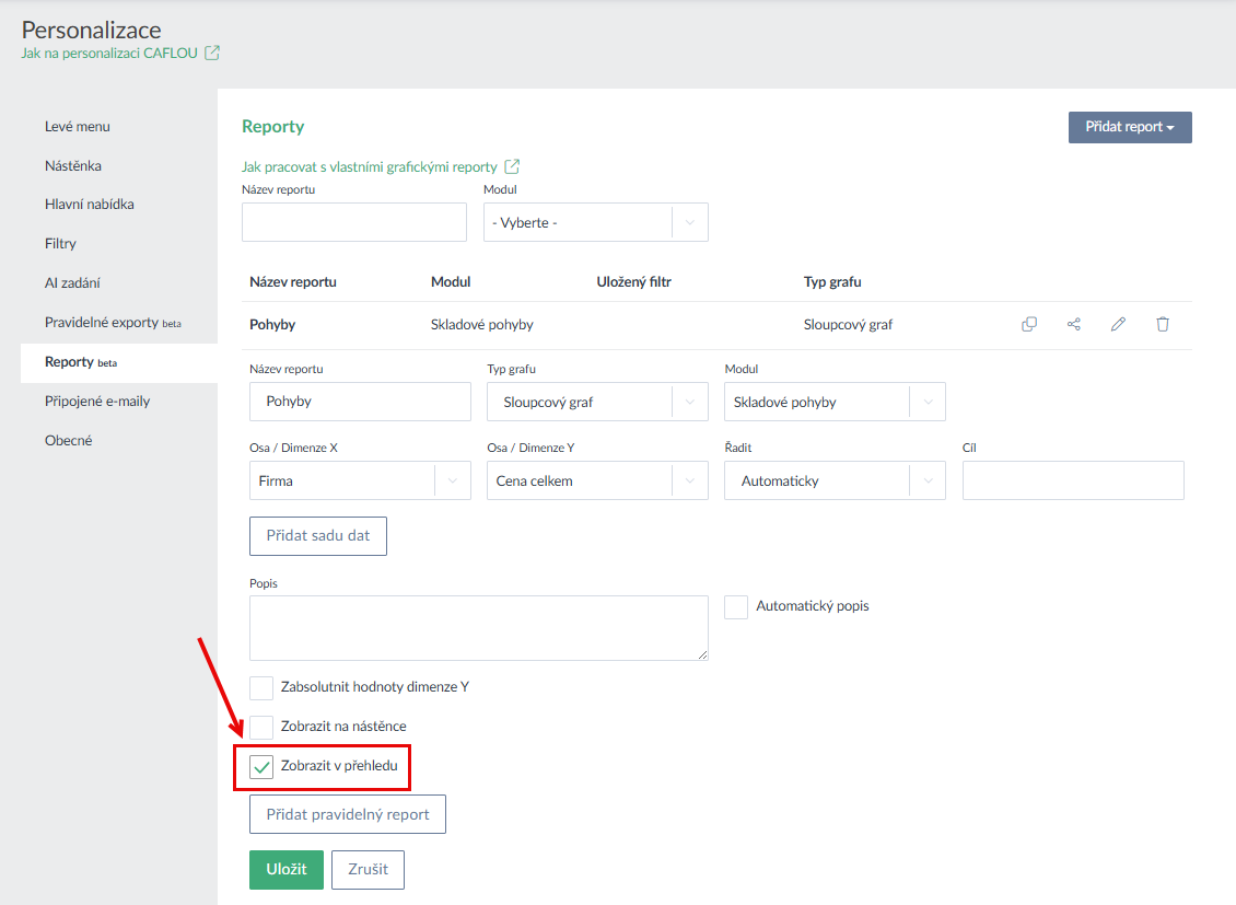 Velkou novinkou je možnost zobrazit si grafické reporty v přehledech jednotlivých sekcí, u kterých lze vytvořit report. Nad každým přehledem lze zobrazit až tři grafy. V nastavení grafického reportu (Personalizace -> Reporty) stačí zaškrtnout volbu "Zobrazit v přehledu".