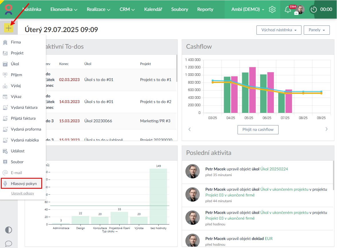 Velkou letní novinkou jsou Hlasové pokyny zpracované přes AI. Jsou tu pro všechny, kteří nemají čas momentálně něco vypisovat, jsou třeba na mobilu, jsou na cestách, spěchají do práce, stojí v koloně aut na dálnici...pak určitě oceníte, že můžete i za chůze nebo ve spěchu rychle vytvořit Firmu, Úkol, Kontakt nebo Komentář.