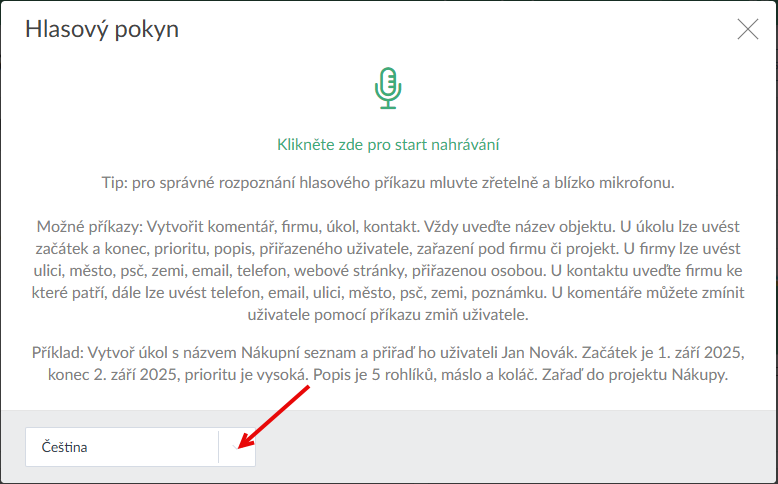 Podrobný návod nazlete zde ve Vzdělávacím centru: Hlasovými pokyny vytvořte firmu, úkol, kontakt nebo komentář