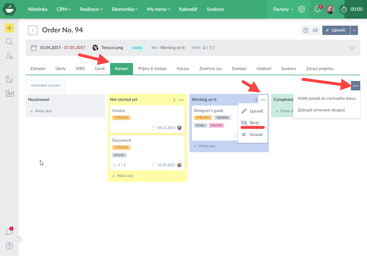 Doposud změna pořadí sloupců ovlivnila všechny projekty a také hlavní přehled úkolů (ve formě Kanbanu) a schovat nepotřebné sloupce nešlo vůbec.