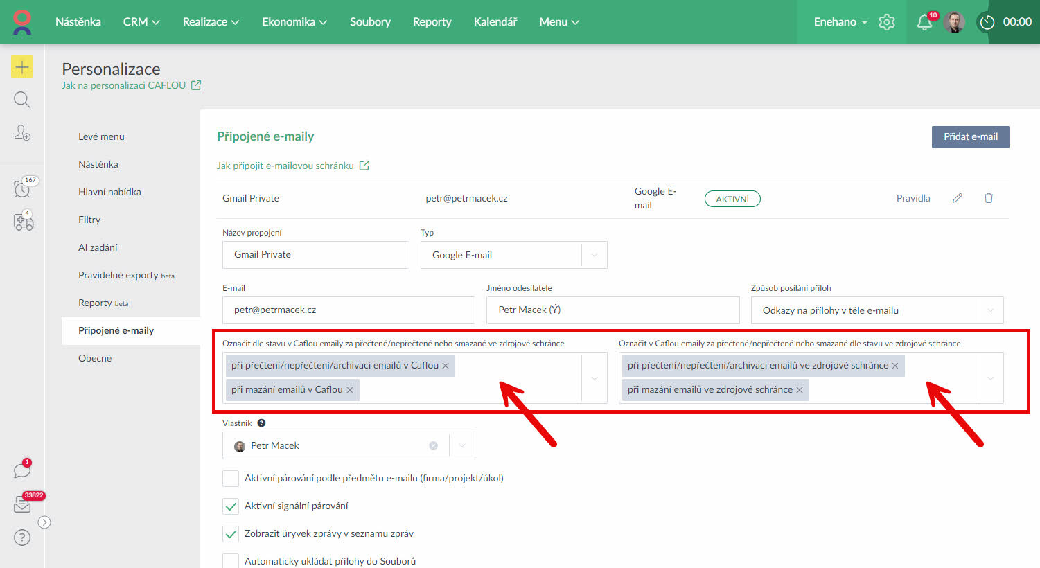 Oboustranná synchronizace Gmailu a Outlook v reálném čase - pokud máte svoji schránku na Gmailu nebo Outlooku napojenou do Caflou, pak lze nyní aktivovat synchronizaci stavů emailů (přečeteno/nepřečteno, archivováno, smazáno) a to oběma směry: