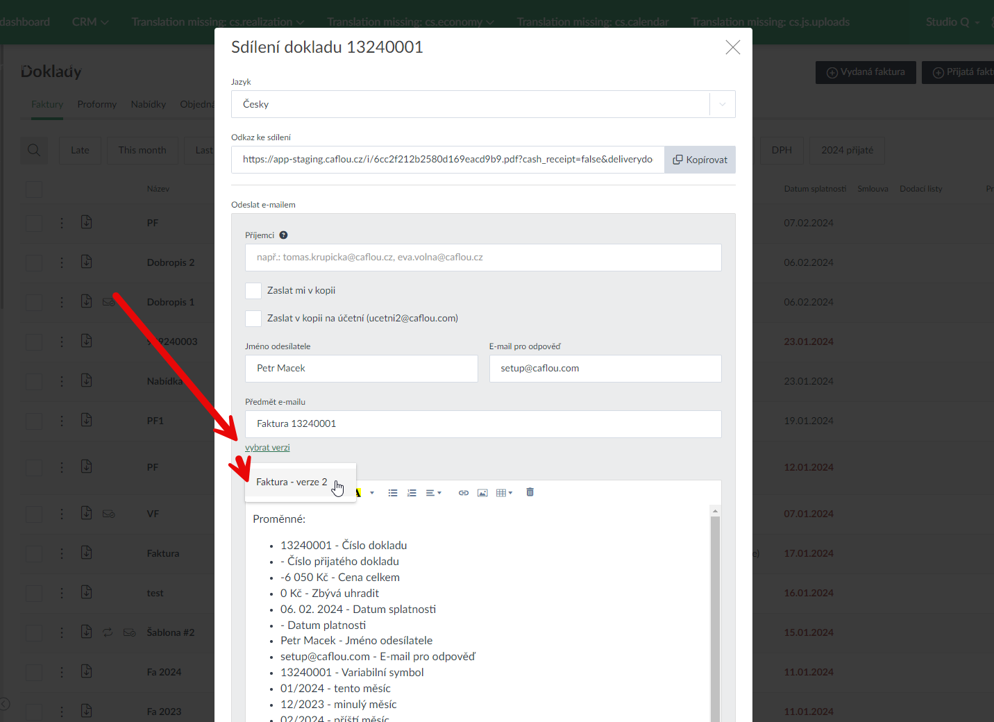 Více variant šablon sdílení dokladů (faktury, nabídky, objednávky...) - pro sdílení dokladů si nyní můžete připravit více variant šablon. V Nastavení dokladů, v sekci Sdílení si můžete ke každému dokladu vytvořit verze šablon a to i v jazykových mutacích. Verzi si pak zvolíte ve formuláři sdílení: