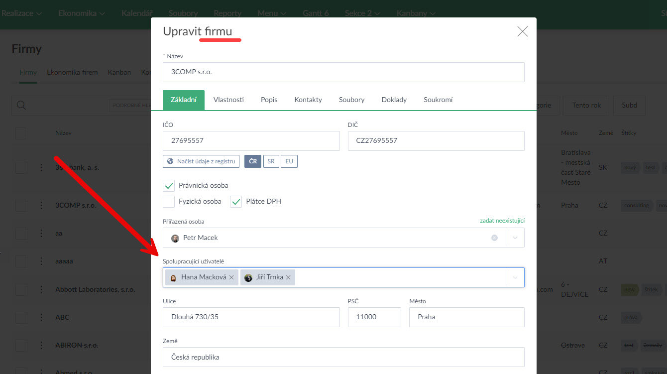 Nová role "Spolupracující" na firmě - doplnili jsme novou roli u objektů typu "firma". Můžete tedy k firmě přiřadit více uživatelů než jen přiřazenou osobu a tím jim nastavit této roli odpovádající práva: