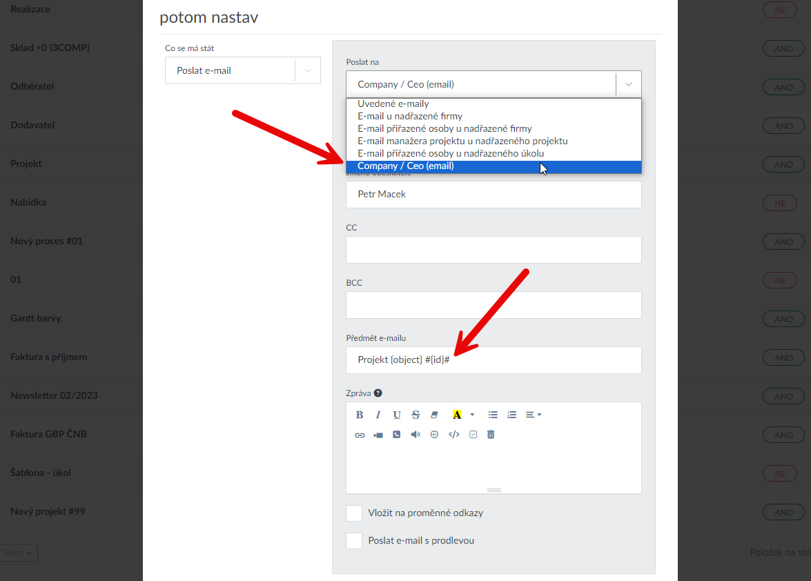 - mezi adresáty lze nyní relativně vybrat i jakýkoliv vlastní atribut typu "email" pro firmu, projekt a úkol - tedy pokud se má email o změně stavu projektu poslat na vybraný email, můžete ten určit přímo u projektu a na něj se zpráva odešle