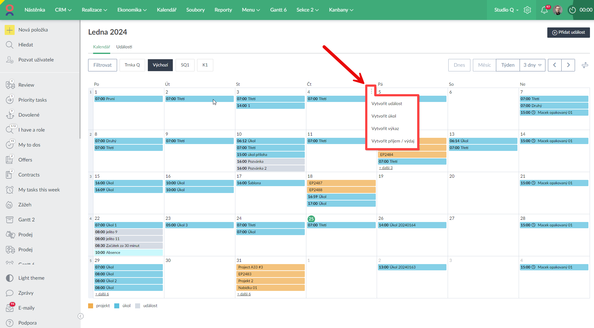 Nové akce v kalendáři - přímo v kalendáři lze zadat úkol, výkaz nebo příjem/výdaj. Neznamená to, že výkazy a příjmy/výdaje lze v kalendáři zobrazit, ale můžete je k danému dni či hodině vytvořit: