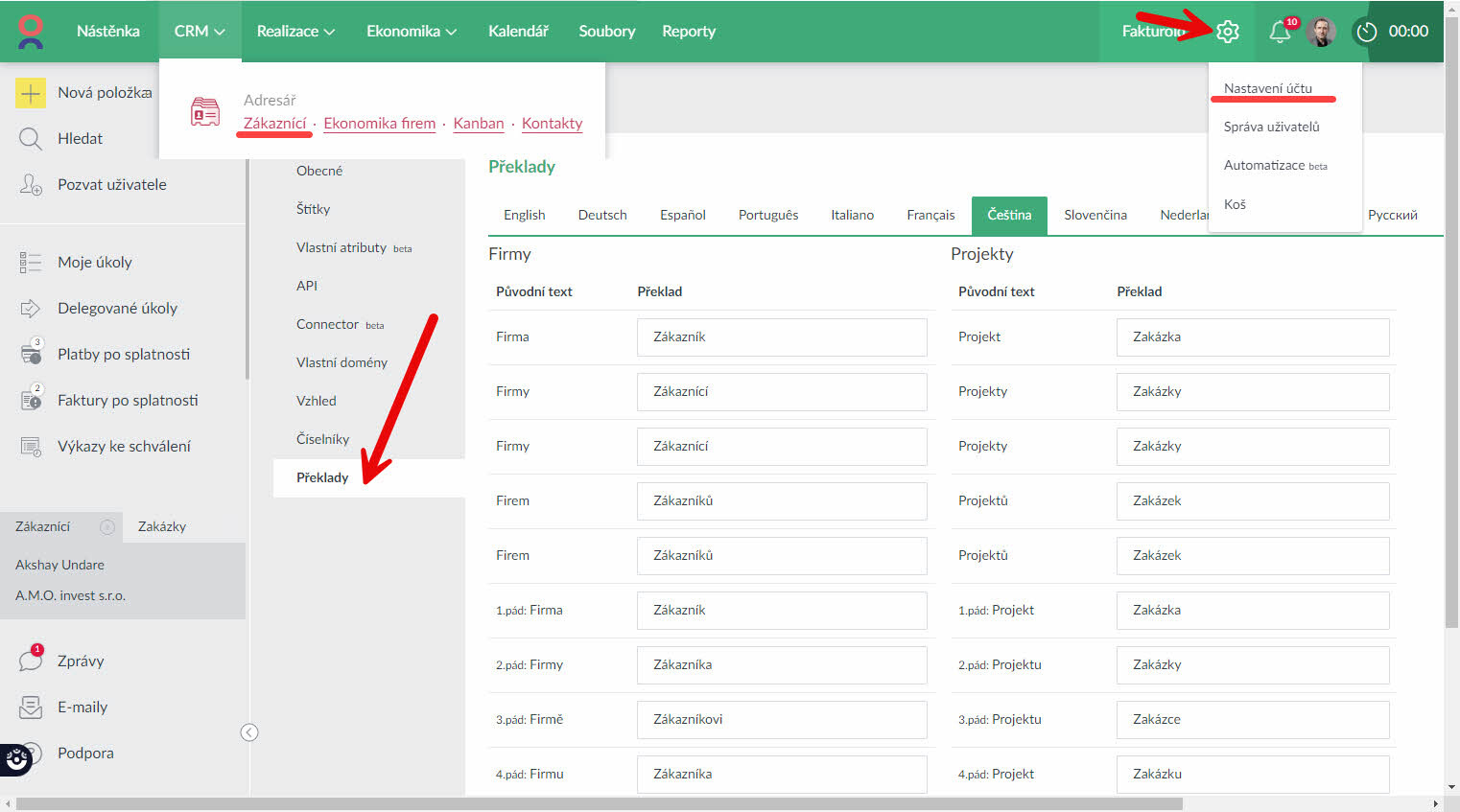 Vlastní názvy objektů (firmy, projekty) - např. pokud vám nevyhovuje termín "firma", lze ji přejmenovat na "zákazník", "projekt" lze zase třeba přejmenovat na "zakázka" a tato změna terminologie se projeví napříč systémem: