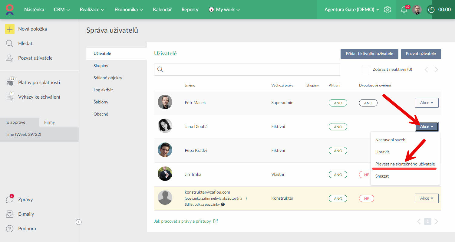 Převedení fiktivního uživatele na běžného uživatele - pokud pracujete s fiktivními uživateli a potřebujete z takového uživatele vytvořit uživatele regulérního, na kterého se vše přenese (např. úkoly, projekty, výkazy apod.), pak nyní ve Správě uživatelů snadno tento přesun provedete:
