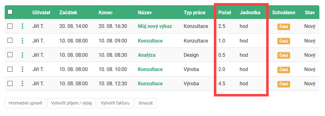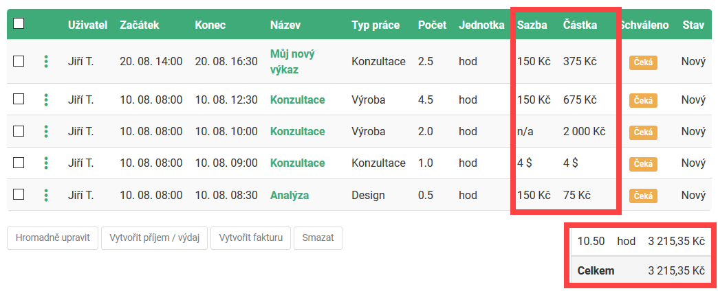 Uživatel, který nemá vidět částky sazeb, nevidí ani souhrnné částky v přehledu výkazů, vidí jen jednotky, už ne částky - viz přehled vlevo (bez částek) vs. vpravo (s částkami):
