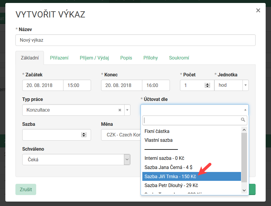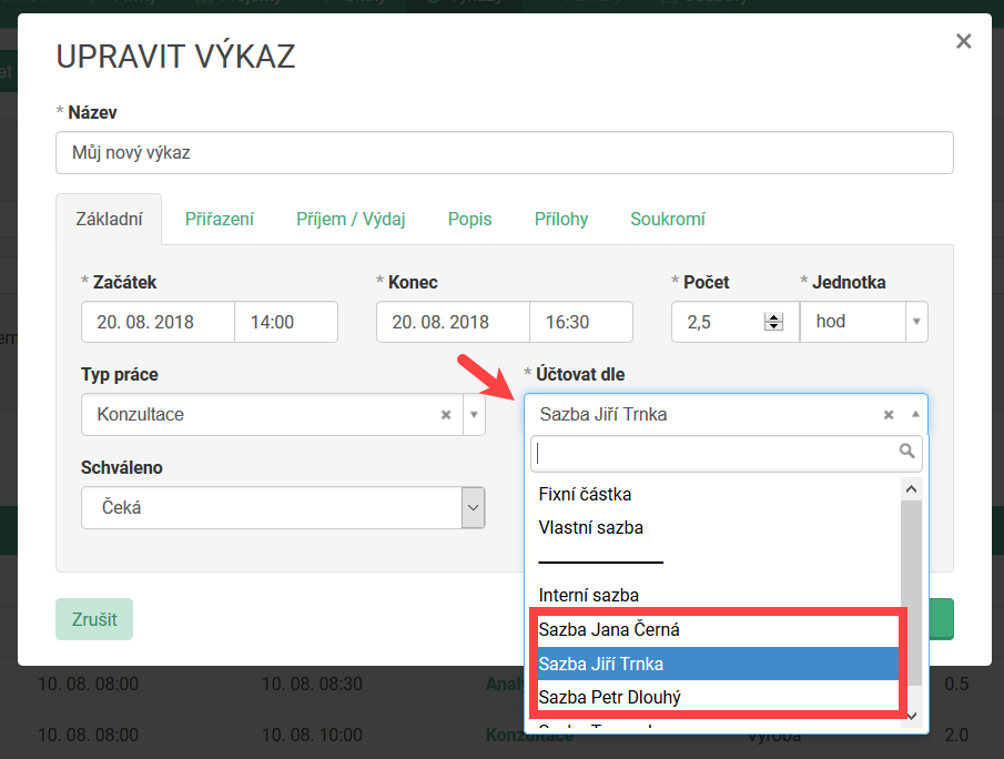 Pokud zvolíte tuto cestu, je dobré sazby pojmenovat tak, aby každý uživatel věděl, jakou sazbu zvolit, např. přidáním jména uživatele k sazbě (viz "Sazba Jiří Trnka" v naší ukázce, nebo třeba "Trnka konzultace", "Trnka servis", pokud je třeba odlišit více typů práce).