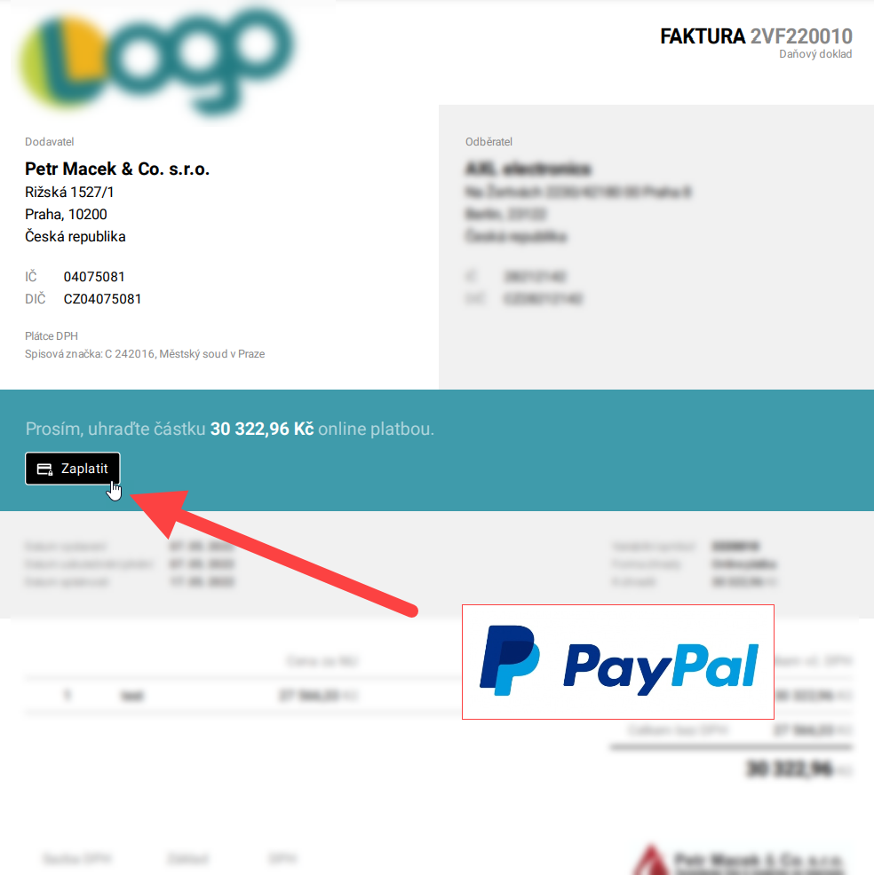 Umožněte svým zákazníkům platit vaše faktury tzv. online platbou, např. platební kartou. Zrychlíte tak přísun peněz do vašeho cashflow a zákazníkům dáte možnost, kterou mnohdy preferují. Můžete jim dát i na výběr, platba převodem + možnost zaplatit kartou nebo umožnit pouze "online" platbu. Faktura pak může vypadat takto:
