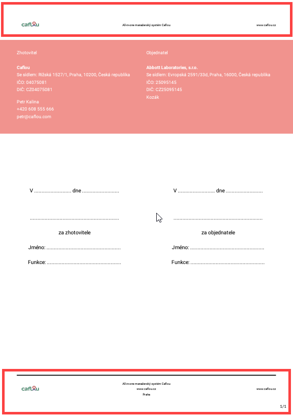 U smluv si v Nastavení dokladů, v sekci Vzhled, můžete nastavit výchozí patičku i hlavičku. U smluv lze patičku i hlavičku upravit i ve formuláři smlouvy. Patička a hlavička smlouvy může vypadat např. takto: