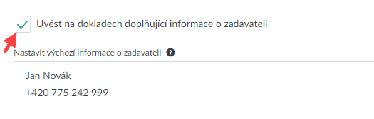 V Nastavení dokladů, v sekci Vzhled, můžete zvolit, zda uvést na dokladech doplňující informace o zadavateli: