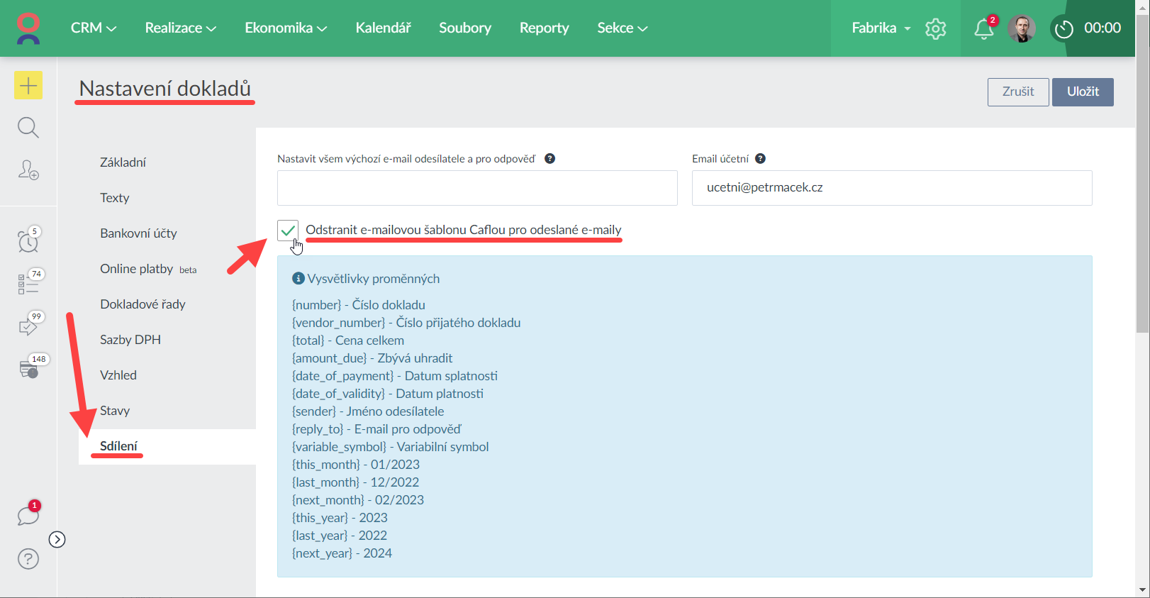 V Nastavení dokladů, sekci Sdílení, si můžete zvolit, zda z emailu, které skrze Caflou posíláte, chcete odstranit "branding" Caflou: